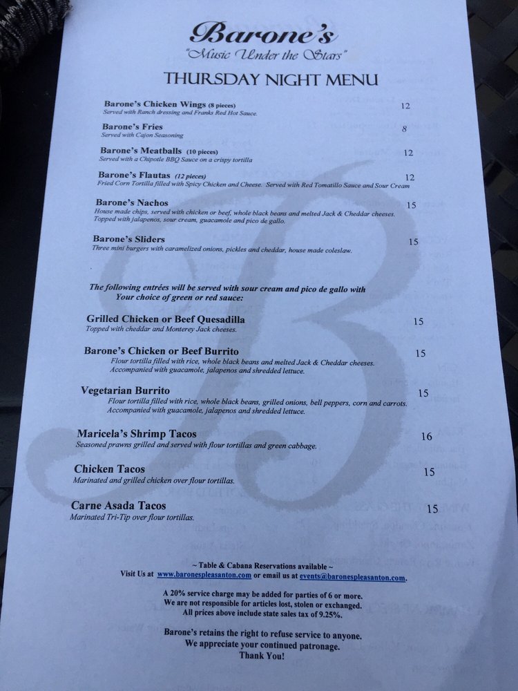Welcome to Barone's Restaurant, a charming diner nestled in downtown Pleasanton, California. Renowned for its inviting atmosphere and exceptional service, Barone's presents a delightful menu that skillfully combines classic Italian flavors with local ingredients. Each dish, from the Beef Carpaccio ($23) to the exquisite Seafood Platter ($30), showcases the restaurant's commitment to quality.